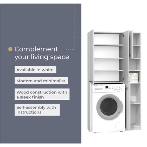 - MODERN & VERSATILE DESIGN – Keep your washing machine tucked neatly in this stylish storage freestanding surround cabinet. It features an outward opening double-door, 4-compartment top shelf and a side cupboard with shelves for extra storage to organise your laundry room
