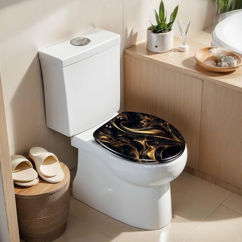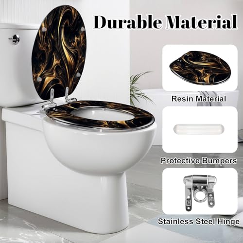 WHFEOIV9RE Elongated Toilet Seat Abstract Marble Fluid Art Painting Alcohol Ink Style Black Gold Resin Slow Quiet Close with Quick-Release Hinges Easy to Clean Install