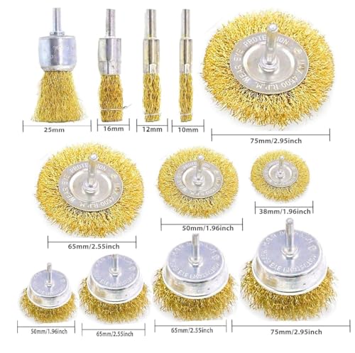 - 12 Metal Brushes – A brush type and size for any application. Includes: 75mm, 65mm, 50mm Cup brushes , 75mm 65mm, 50mm and 38mm wheel brushes, and 25mm , 16mm, 12mm,10mm straight brushes