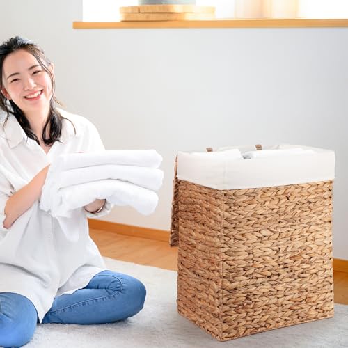 Woodluv Laundry Basket With Lid Large, Water Hyacinth Laundry Hamper, Wicker Bin Storage Organiser, Washing Basket for Dirty Clothes Bathroom, Natural, 44 x 34 x 56 (H) cm