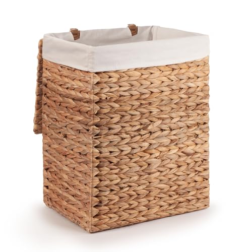 Woodluv Laundry Basket With lid Medium, Water Hyacinth Laundry Hamper, Wicker Bin Storage Organiser, Washing Basket for Dirty Clothes Bathroom, Natural, 38 x 28 x 48 (H) cm