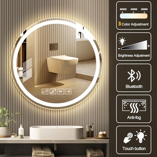 wowspeed Round 60 * 60cm Bluetooth Bathroom Mirror with LED Lights, Wireless Music LED Vanity Mirrors for Bathroom, Wall Mounted Smart Mirrors, Anti Fog, 3000K/4500K/6500K, 120° Beam Angle, Dimmable