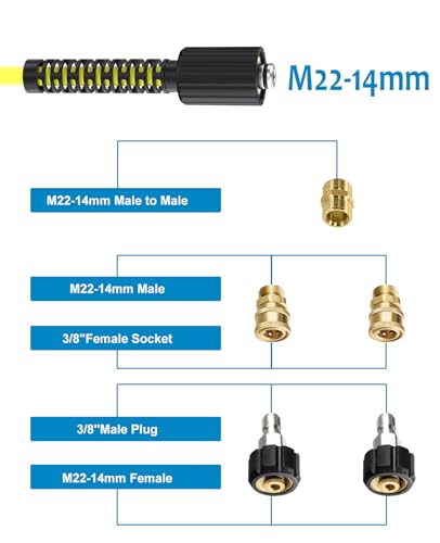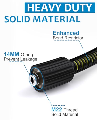 - Broad Compatibility – But Know the Limits: Our m22 pressure washer hose equipped with standard M22-14mm fittings(NOT M22-15MM), this pressure washing hose fits most major pressure washer brands like Ryobi, Greenworks, Simpson, Generac, and Craftsman.( Does NOT fit Karcher K-series or Bosch AQT models. Avoid compatibility issues by double-checking your machine’s connector size.)