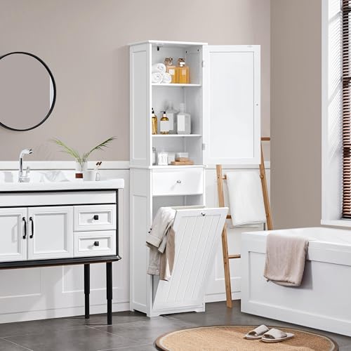 Yaheetech Bathroom Tall Cabinet with Laundry Bin, Bathroom Storage Unit with 1 Drawer and 1 Laundry Hamper, White, 180cm Height