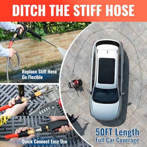 - [Comprehensive Extension and Connection Kit] Supplied with a versatile adapter set, including two 3/8-inch quick connect fittings for rapid attachment and one M22 male extension coupler. The coupler allows you to connect this hose to your existing line, effectively extending your reach to cover larger driveways or roof areas without moving the machine.