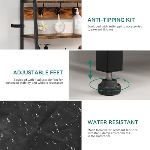 - Laundry Hamper with Shelf: 4 metal hooks and 2 side metal hooks are good helpers to satisfy your hanging needs of daily items such as brushes, towels, hats, bags, and more; The 4-tier storage shelf makes full use of the vertical space to store your laundry detergent, shower gel, toiletries, books, plants for convenient use