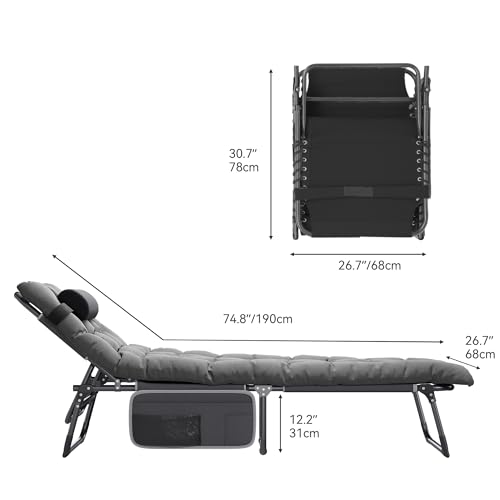 YITAHOME Reclining Sun Lounger with Cushion 190x68x31cm Folding Sun Bed 5 Position Adjustable, Sunloungers with Removable Headrest & Side Pocket Load Capacity 300lbs for Garden, Beach, Camping, Gray