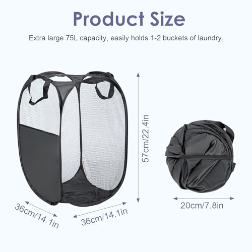 Youyijia 75L Folding Laundry Basket Collapsible Large Washing Basket with Mesh Design Foldable Portable Laundry Hampers for Bathroom Bedroom College Dorm and Travel Black