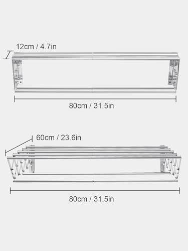 • Retractable Length: The clothes drying rack is made entirely of stainless steel, very sturdy and well made. Clothes drying rack dimensions: 80x60x20cm. Retractable length front and back: 12 – 60cm