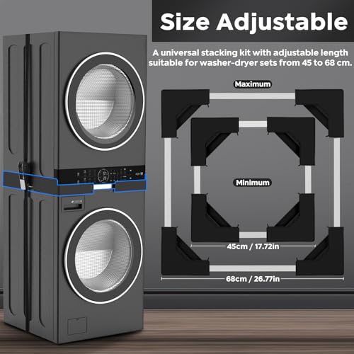 - Adjustable Size Design: The size of the stacking kit can be adjusted according to the dimensions of your washing machine and dryer. Our universal stacking kit is suitable for washing machines and dryers between 45-68 cm