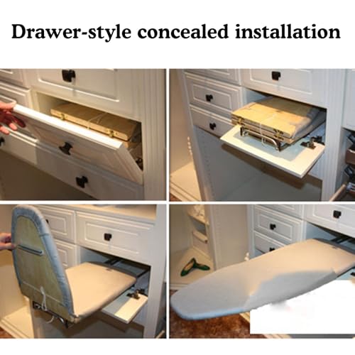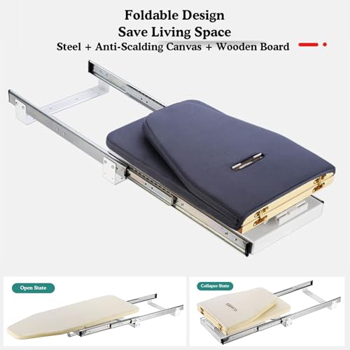 - DAMPING BUFFER TRACK: The folding ironing board comes with a mute track, which provides low friction, Three-section damping hydraulic double-row track, powerful hydraulic pressure, prevent rebound, automatic buffering when retracting.It can be pushed and pulled easily without force.It can be installed in the closet or cabinet, very hidden and easy to store.You can use it for a long time