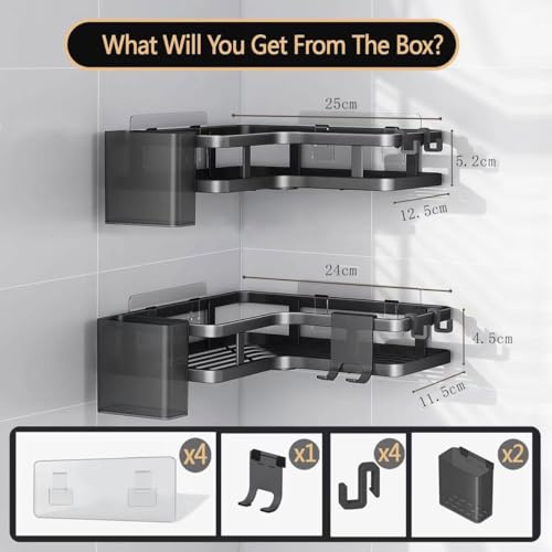 Space saving and 90 degree design:Our bathroom decor is designed for making great use of corner space. Shower accessories adoption of large-area strong adhesive binder, Withstands loads up to 35 lbs. shower organiser most of the toiletries in your bathroom, Making it very convenient for use in the shower.
